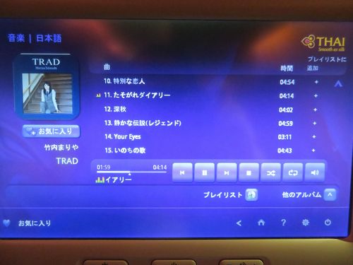 定刻に出発したフライト。ここ数回乗っているお馴染みの新しい機体。きれいでよい。それにしてもタイ航空、機内プログラムがいつも同じで変化なし。日本映画は前回同様、小栗旬の『信長協奏曲』だけ。仕方なく、音楽を聴くが、これも前回と何も変わっていない。昨年から一度も入れ替えていないのではないだろうか。それでも私は竹内まりあのアルバムに聞き入る。彼女の音楽、基本的に変わっていない。特に『いのちの歌』はNHKドラマの主題歌、確か満島ひかりが主演だったと思うが、なんともいい。