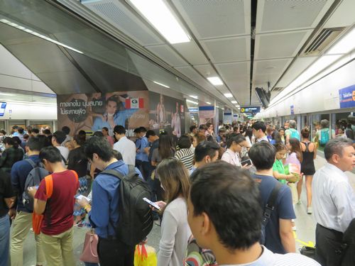 地下鉄に乗り換えたが、ラマ9駅へ向かう列車のホームは人で溢れかえっていた。どうしても乗れそうにないので、反対向きの電車に乗り、一駅戻ってから乗り直した。バンコックでもこんなことがあるんだな。退勤時刻と雨が重なり、一度に人が集まり過ぎたためらしい。ラマ9駅で地上に上がると、まだ雨は降っていたが、目の前のビルに飛び込む。