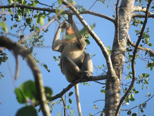 ボートには我々の他、中国人の団体が乗り込んできて満員となる。ボートは川沿いに少し行き、いきなり停まると2人のガイドが何かを指さしている。英語と中国語、どちらも猿と言っているのでよく見ると、木の上に猿が何匹もあり、自由気ままに遊んでいる。そこで初めてこのツアーが猿を見るためのものだったと知り、ちょっと愕然とした。しかしボートは数か所に停まり、その都度猿を眺め、写真を撮る。最後に夕日を写真に収めて終了。
