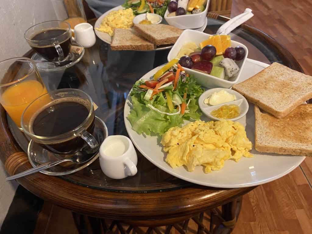 かなり歩いて帰りつく。久しぶりに充実した散歩となり、腹が減る。近所の店に入り、ブレックファーストを頼んでみる。トーストとベーコン、目玉焼き、コーヒーで85バーツはまあまあの値段かな。午後は疲れが出てゆっくりと休息する。