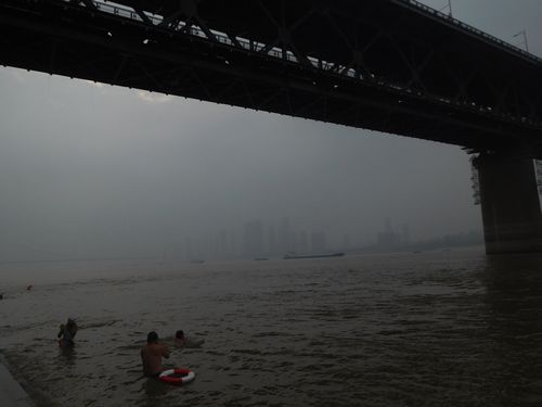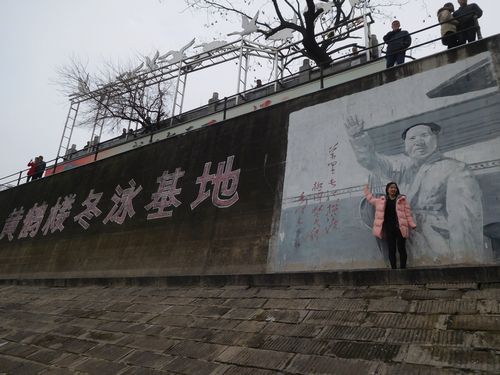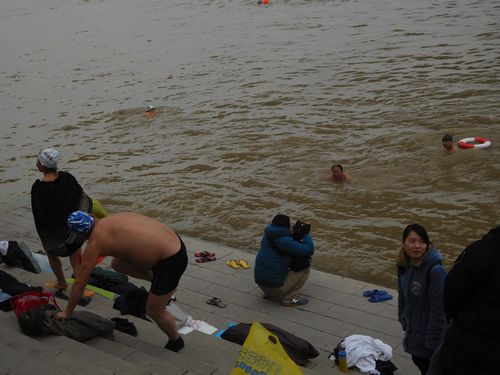 川沿いに出ると人だかりがしていた。行ってみると、何とこの寒い中、寒中水泳をしている人々がいた。いずれも老人で、水泳クラブの人たちだ。昼間とはいえ、体感温度は零度以下ではないだろうか。裸の老人をダウンジャケットを着た若者が眺めて、写真を撮っている。何とも不思議な光景だ。壁を見ると、毛沢東の絵が描かれていた。毛沢東は何度も長江で水泳をしており、その名残?だろうか。いずこも老人は元気だ。