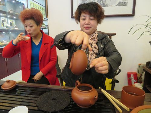 お母さんの仲良しの女性、茶壺を作る職人さんが自ら作った茶壺を使って紅茶を淹れてくれた。その道数十年のベテランだ。大き目の茶壺にたっぷり紅茶を淹れて、ゆっくりと湯を注いていく。『紅茶はたっぷり入れるのがよい』という。ここにある茶壺も殆どがかなり大きいのはそんなわけだろうか。そこへ知り合いの女性が三人入ってきて、大きな茶壺は大活躍を始める。