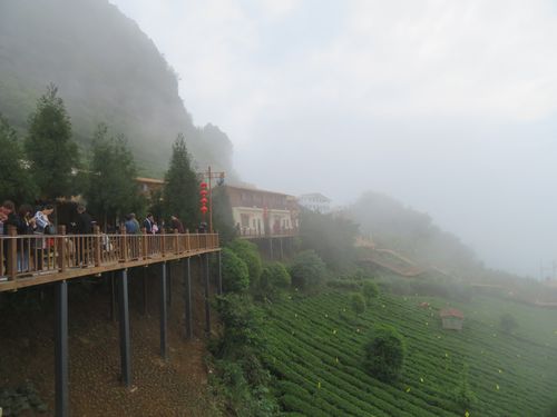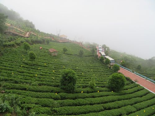 バスは丘の上に上って行く。いや丘というより山だ。湄潭も周囲は山なのだ。だからここが茶畑として選ばれたのか。山道を10数台のバスが連なって登って行く。ついたところは景色を楽しむようにできていたが、霧が凄くてよく見えない。それでも目を凝らしてみると、斜面に茶葉が張り付いている。少し霧が晴れると皆が一斉に写真を撮る。