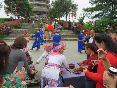更には車で移動。着いたところは大きな塔が建っていた。そこの前で少数民族の衣装を着た女性がお茶を淹れ、観光客に配っていた。踊りも披露されている。完全な観光地なのだが、周囲は全て茶畑なのである。エレベーターで塔の上に上ってみた。上でもお茶が振る舞われており、お茶を飲みながら周囲を見渡したのだが、何と360度、全て茶畑のみ、地平線の向こうまで茶畑が繋がっている。これだけの規模の茶畑は世界でも稀らしい。それでついた名前が中国茶海。さっきの小茶海が小さく見てしまうから恐ろしい。