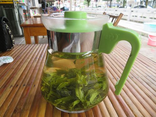 まずは寺に上る前に、下の街で昼ご飯を食べた。そこは一応観光地のようになっていたが、お客は多くない。食堂に入り、エビや魚を食べる。この辺の名物らしい。お茶は普通の径山茶がポットで出てくるからうれしい。私は以前よりこの緑茶が好きだ。誰も知らなかった頃が懐かしい。