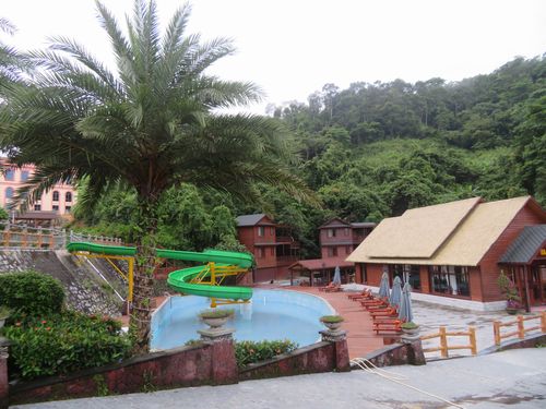 翌朝は早めに起きて、周囲を散歩してみた。昨晩は暗くて分からなかったが、実は相当大掛かりな開発がなされていた。名前を茶渓谷というらしい。泊まっていたホテル部分の他、別館あり、多数のコテージがあり、プールなどの施設も整っていた。更に歩くと分譲用の家も建てられている。一体どれだけの開発をしたのだろうか。今日は天気が悪いが、もしよければ下が一望できる空間もある。