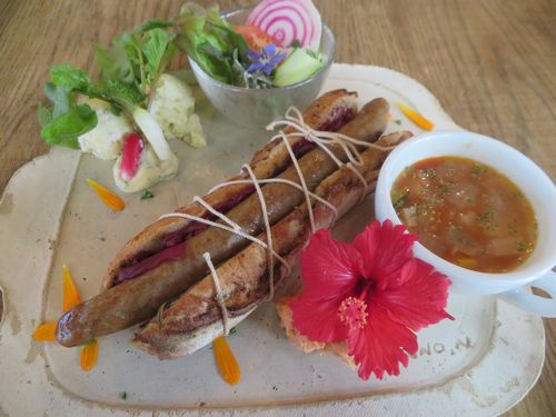 ここはかなり敷地が広く、地元の物産を売り、レストランもある。県のプロジェクトのようだ。沖縄には補助金が沢山出ているな、などと感じてしまう。おしゃれなレストランでランチを注文するが、やはりどことなく涼しい。ただこんな日でも宣伝のための撮影が行われており、店の人が申し訳ないと言って、こちらで採れた芋などをくれた。食事は地元やんばるで採れる旬の野菜をふんだんに使っており、優しい感じがした。