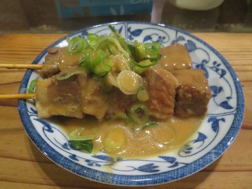 更には店の隅では牛筋肉に味噌ダレを付けて焼いたどて焼き『すじどて』が作られており、お腹は一杯ながらこちらにも挑戦した。私はこういうB級食物が大好きだ。お酒を飲む人なら、まずはすじどてをあてに一杯飲み、その後中華そばを食べるのだろう。酒を飲めないと楽しみが少し薄れるが、すじどてが食べられたので満足して戻る。