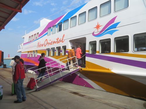 そこは金門名物の麺などを売る土産物店。遠東が提携しているのだろう。小さなお椀一杯の麺が無料で試食できたが、特に購入する人はいなかった。バスは物産セールスを行い時間調整したのだ。ターミナルにはフェリーが出る40分ぐらい前に着き、預けたパスポートで買われたフェリーチケットと弁当を受け取り、イミグレを抜けて、フェリーを待つ。その間にもらった弁当をかき込む。まさかここで弁当を食えるなんて、すごい流れ作業だ。