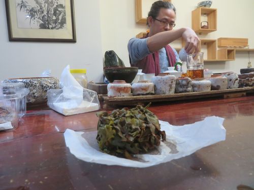 店に戻ると張さんがお客の若者と茶を飲んでいた。この店は漳平水仙を扱うことで有名らしい。張さんは漳平の出身で、その歴史も探求しており、話を聞く。最近日本でも話題になっているお茶だが、思ったよりも幅が広い。その歴史は100年を越え、地元には紙で包む時に押される印判が残り、型を取る道具も残されていた。