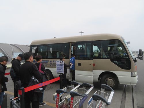 約4時間の飛行時間で、ほぼ定刻に成都空港に着いた。荷物は預けていないので、そのまま外に出た。待ち合わせ場所は国際線到着ロビー。ところがターミナル間はかなり距離があるらしい。どうやって行けるのか聞いてみるとシャトルバスがあるというので、1回出たターミナルにまた入ると荷物検査が面倒。それでも係員が親切に案内してくれて感激。シャトルバスは小さかったが、1㎞以内を走行して、無事国際線ターミナルに到着。