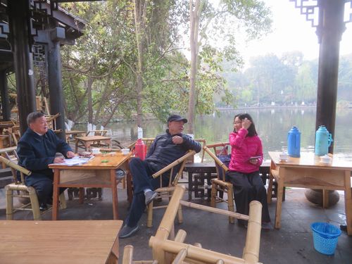 ホテルをチェックアウトしてバスに乗り込む。日本人の団体だから時間に遅れる人はいない。まずは朝の人民公園に乗り込む。庶民の茶文化体験ということだが、天気も良くなったので、屋外で茶を楽しむのはとても気分が良い。そして池のほとりでお茶を飲み始めると、隣に座っていた老人たちと何となく交流が始まってしまうのが、何とも面白い。