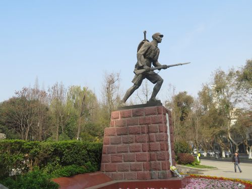 1時間ほどそこにいた。今日はずっとここに座っていたかったが、茶旅行には日程が決められており、そんな自由は全くない。歩いて正門から出る。ガイドはスルーしたが、そこには抗日兵士の像が立っていた。路上では新疆のウイグル人が旨そうなナンを売っている。これも一つの現代の光景だ。