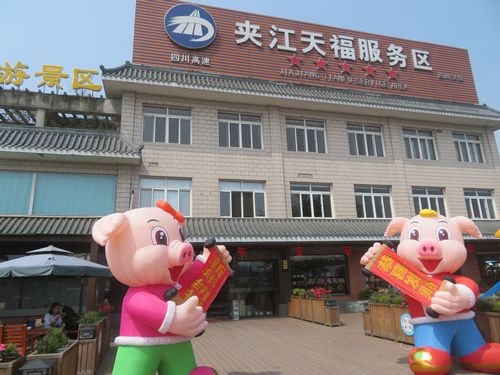 成都市内を離れ、高速道路に乗る。2時間ほど走って、サービスエリアで停まる。何とここは、あの天福銘茶が作った、お茶がテーマのSAだった。中では子供たちのケーキ作り教室が行われており、賑やかだ。ここには茶畑、博物館、お茶屋などが併設されており、このSAに入れば、お茶のことが一通り分かるシステムとなっている。しかも規模がデカい。我々は時間が無いので、ここでランチを食べ、ちょっとお茶を見ただけ。博物館は入場料30元も取るらしい。天福の中国ビジネス、スケールが大きい。