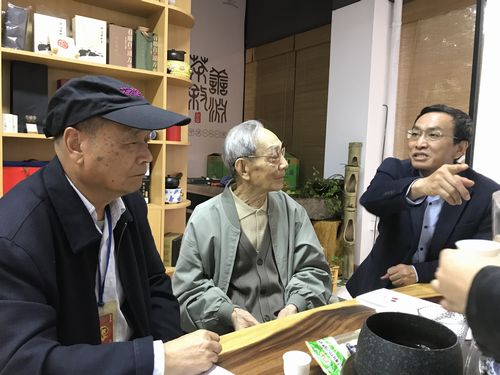 午前中は魏さんのオフィスに行くと、魏さんと鄭さんに連れられて、どこかへ向かった。そこはアパートが並ぶ一角で、その1階にきれいな茶室が設えられていた。そこに昨年もお会いして、包種茶について解説してくれた陳先生が待っていてくれた。もうお一人、89歳の寥さん。二人とも、張天福老師と一緒に働いたことがあるというので、特別にそのお話しを聞いた。当然一緒にいた期間のことは思い出せるが、戦争前がどうだったのかを知る人はいないようだ。何しろ張老師は一昨年108歳で亡くなっているので、生き証人は非常に少ない。