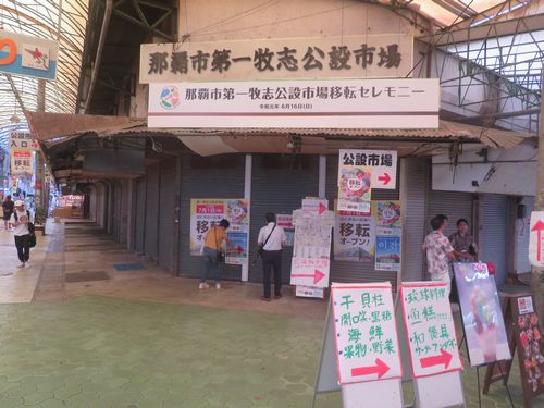 今日は午後2時におもろまちまで行くことになっていた。雨が降っていれば当然ゆいレールで行くのだが、ちょうど雨は止んでおり、まだ時間もあったので、国際通りを歩いてみた。そこで思い出したのが公設市場。確か無くなってしまったというニュースを見たので行ってみたが、すぐ近くに移転しており、既にそちらでの営業が始まっていた。中国人観光客らが、料理してもらって食べようと真剣に魚を選んでいた。