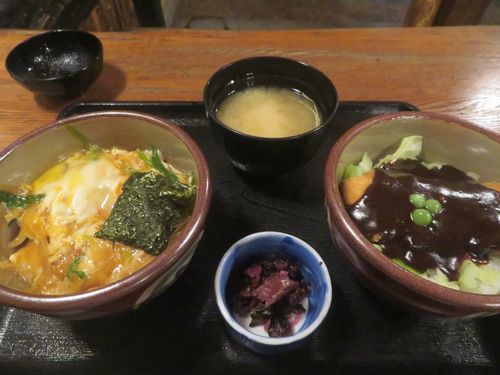 路面電車の中で『野村のかつ丼』の宣伝が流れていたので、行ってみた。ちょっと高級感のある入り口だが、中では食券を買う。デミグラスソースと玉子とじかつ丼のセットを注文した。1000円と庶民的。ホテルまで帰る道すがらも、何となく風情があり、久しぶりの岡山を瞬間的に満喫。