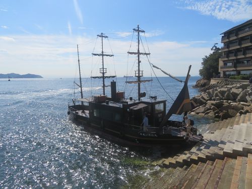 バスで30分、鞆の浦に着く。海風が吹き、さすが汐待の港、何だかいい所に来てしまった、と感じる。海を見ていると、如何にも異国船という形の遊覧船が出航して、観光客を乗せている。坂本龍馬も登場する、あの紀州藩から莫大な補償金を取った、いろは丸事件にちなんだ船だそうだ。