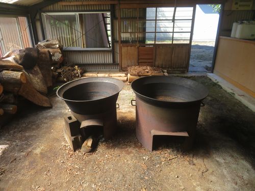 美作と言えばまず思い浮かぶのは剣豪宮本武蔵だろう。武蔵も飲んだお茶、との広告も見られたが、果たしてそんなに古くからお茶作りがあったのか、それはちょっと疑問だった。そんなことを考えているうちに車で、番茶作りの工場に案内された。何となく茶葉を摘む時期(夏)、大きな茹で釜などの設備、製法などは四国の阿波晩茶などを想起させる。ただ茶葉を煮出した汁を茶葉に掛けるところが、決定的な違いかもしれない。色味がよくなるという。