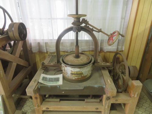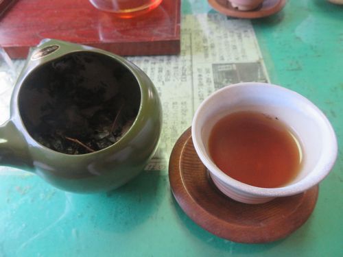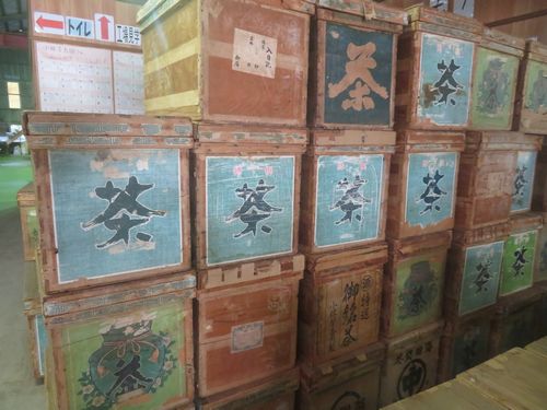 次に店舗に連れて行ってもらい、そこで古い製茶道具や写真などを見せてもらう。勿論この地域でも番茶以外に煎茶などを作っており、戦後は活発な時期もあったという。また写真には昨日訪れた後楽園の茶園が写っており、何とここ美作の人々が茶作りをしていることも分った。古い茶箱にその歴史が感じられる。番茶を飲ませてもらうと、やはりすっきりしていて飲み易い。