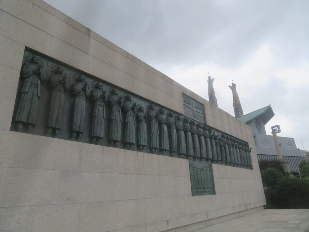 今日はこの辺で終わりにして帰ろうと思ったが、比較的近いところに西坂公園があり、日本二十六聖人殉教地があったので寄ってみた。1597年キリシタン禁令により、京都などで捕らえられた宣教師以下26人がこの地で処刑されたという。現在は二十六聖人の等身大ブロンズ像嵌込(はめこみ)記念碑と記念館が建っている。26人の中には子供もおり、そのブロンズ像には何とも言葉が出ない。