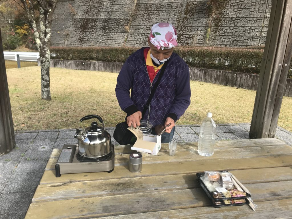 それからお弁当を買い、山の上の方まで登っていく。見晴らしの良い場所でお昼を食べた。さすがお茶農家、Mさんはお茶入れ道具一式を持ち込み、ここでお茶を淹れてくれた。こういう環境で飲むお茶はまた格別だった。紅葉はちらほら見られたが、観光客はほぼいなかった。