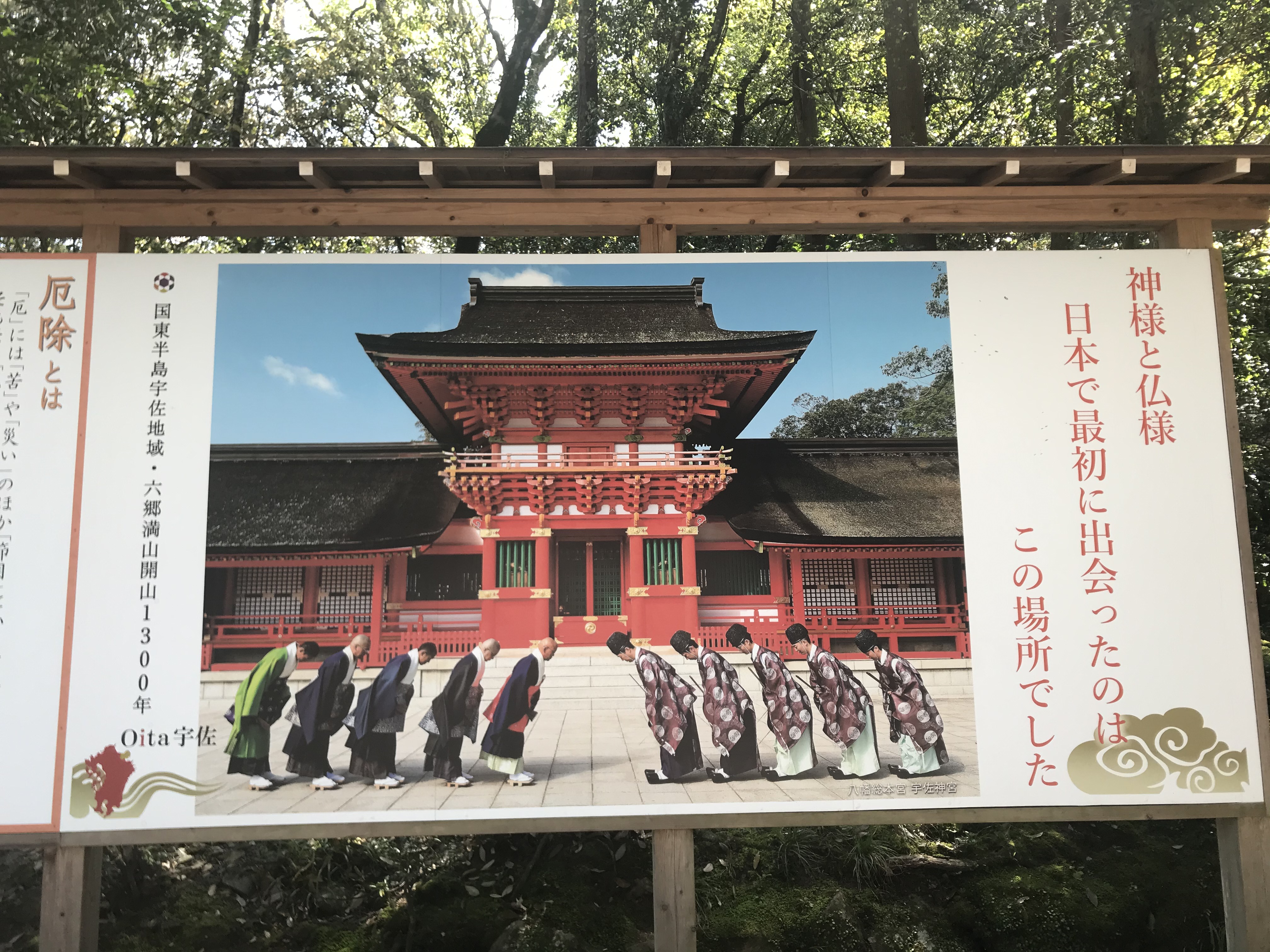 宇佐八幡は広大な敷地を持っており、歩くのは大変だった。先ずは外側から攻めてみたが、何しろ記念碑などが多い。最澄が中国へ行く前にここにお参りし、天台宗を開いた後、また参拝したとか、宮本武蔵と関係があるとか、かつて宇佐参宮線で使われたSLなども置かれている。