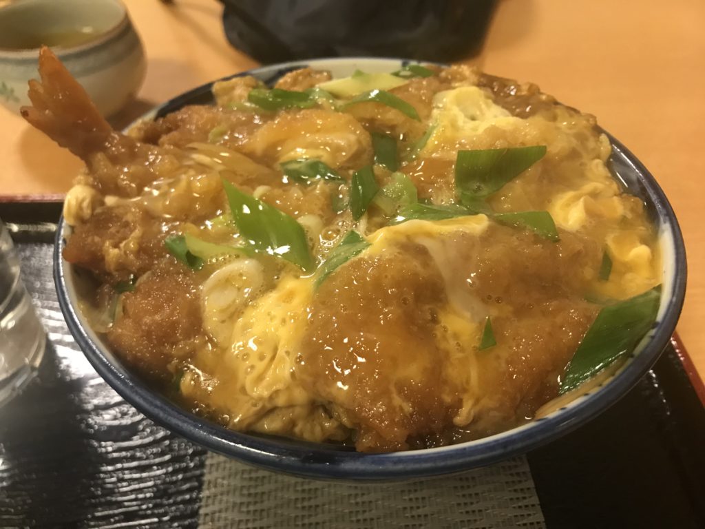 夕方5時になるともう暗くなってきた。その食堂には海老天とカツを煮込んだ、天かつ丼というメニューがあり、注文した。これは甘めで非常に好みの味であり、値段も700円と満足できるものだった。因みに泊っている宿には夜9時半になると夜泣きラーメンがあるので、日の最後はそれを〆に食べてから寝るので、夕飯は早めが良い。