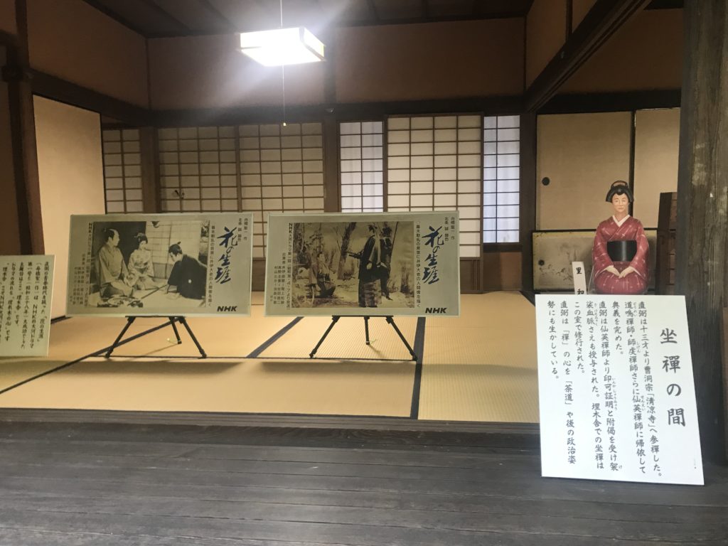 舎内は落ち着いた雰囲気があり、彼が詠んだ句も示されている。お茶室などもあって、やはり直弼と茶は大いに関連がある茶人だと感じる。座禅の間もあり、善と茶の関連も垣間見られる。部屋住みの暗い人生、と思われがちだが、意外と楽しんでいた可能性もある。