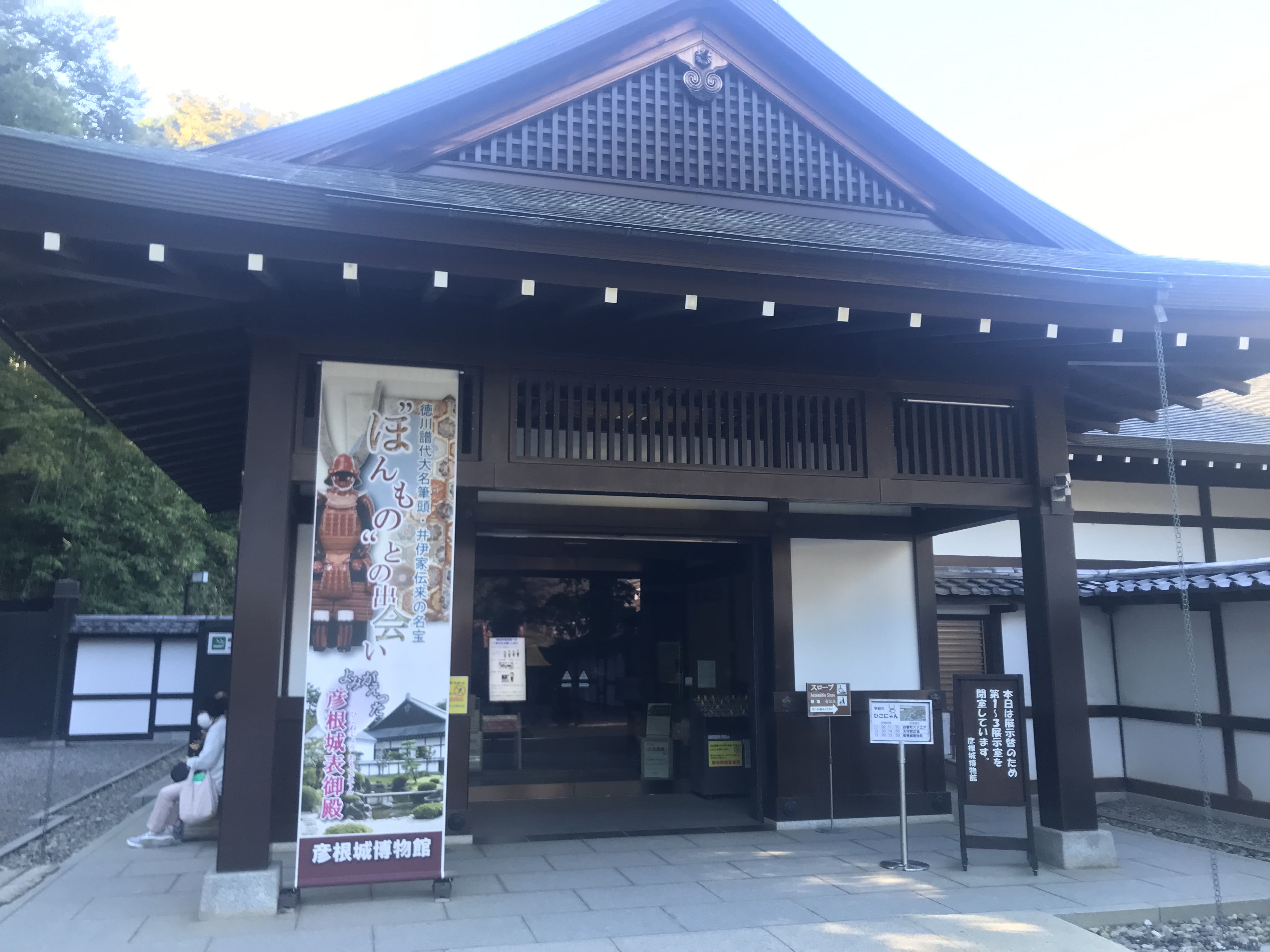彦根城にも入ってみようかと思い、堀を渡ると、そこに宝物館があった。ここで直弼の茶道具などが見られるのではないかと期待したが、何と明日からの特別展のため模様替えで、入れてもらえなかった。明日は何が見られるのかと聞いても答えがなく、驚いて城も見ずに引き上げることとなった。