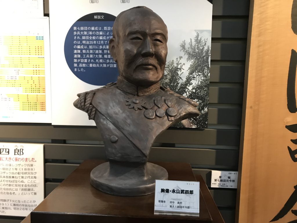 もうこうなるとスタルヒン球場まで歩いていくほかない。途中石狩川を越えていく。球場の手前に、珍しい建物が建っていた。北鎮記念館と書かれているので、中へ入ってみると、ここは何と陸上自衛隊が運営(隣が旭川駐屯地)しているようで、受付の人からして、きびきびしている。