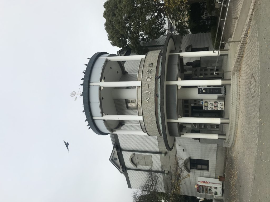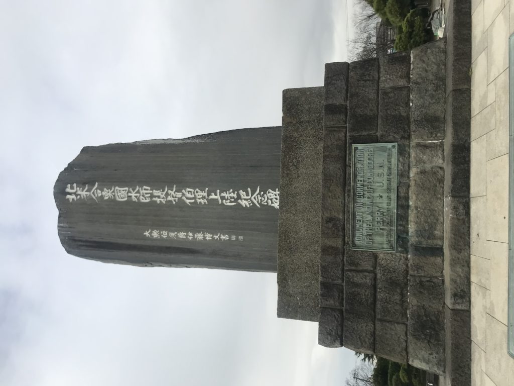 品川からいつも乗る京急。羽田空港に行く時使うので、蒲田以南は滅多に行かない。今回は特急に乗り、京急久里浜駅まで行く。駅前には商店街があり、そこをまっすぐ抜けて行く。15分ほど歩くと海まで出る。そこは久里浜海岸だったが、ペリー公園があった。ペリー上陸記念碑が実に大きい。そして片面に日本語(碑の文字は伊藤博文)、裏面?には英語が書かれている。米友協会(明治憲法にもかかわった金子堅太郎が会長)が資金を集めて明治34年に建てたという。
