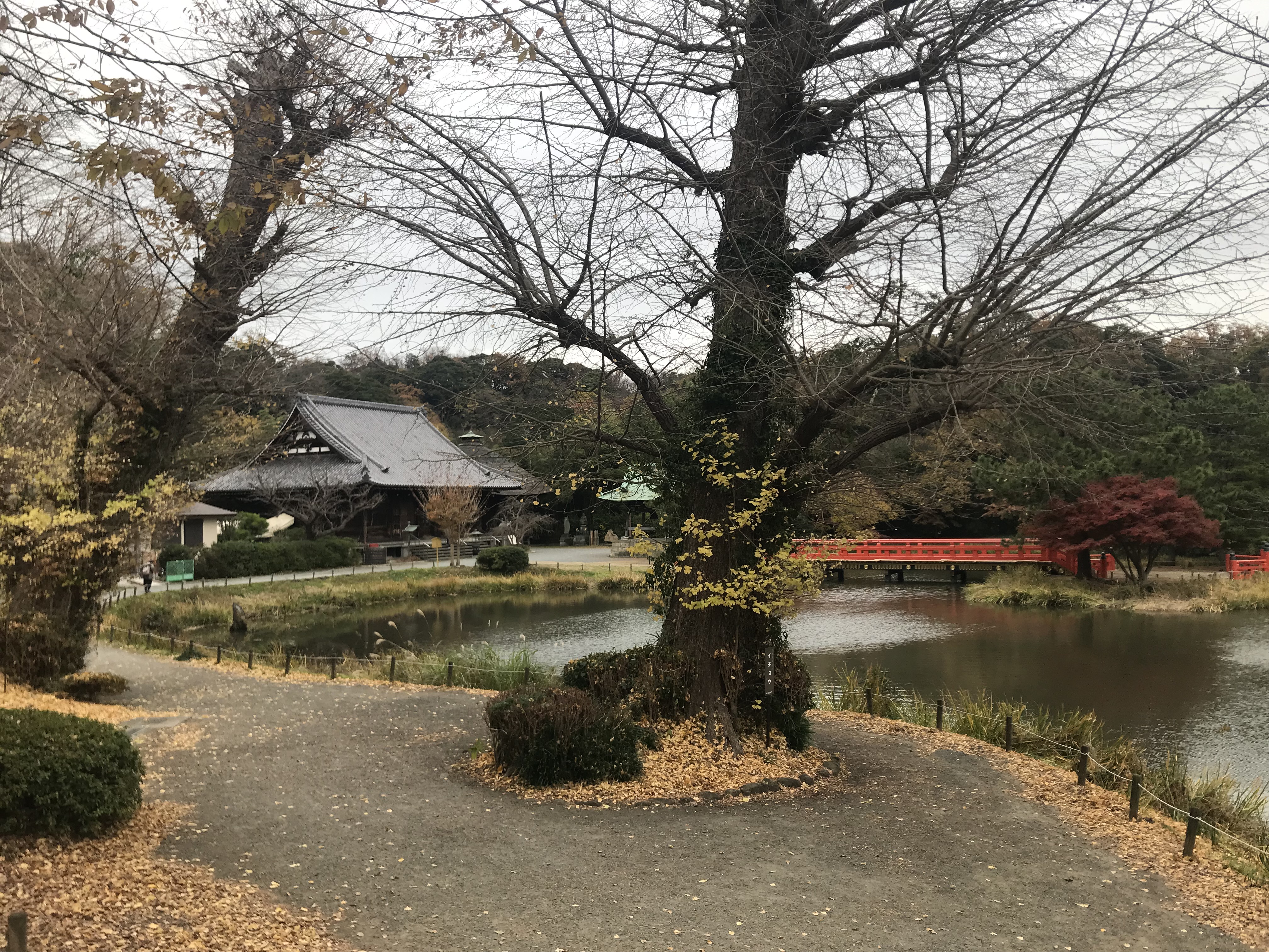 称名寺にも行ってみる。こちらは非常に落ち着いた雰囲気があり、ちょうど紅葉が終わったところで人影もまばら。寒くもなく散策にちょうど良い。山門やお堂も、雰囲気はいかにも鎌倉だった。もとは金沢北条氏(北条実時の像がある)の阿弥陀堂だったが、その後大造営が行われたという。特に金沢貞顕が作った浄土庭園は非常に趣があり、歩いていると心地よく、その雰囲気は今に繋がっている。