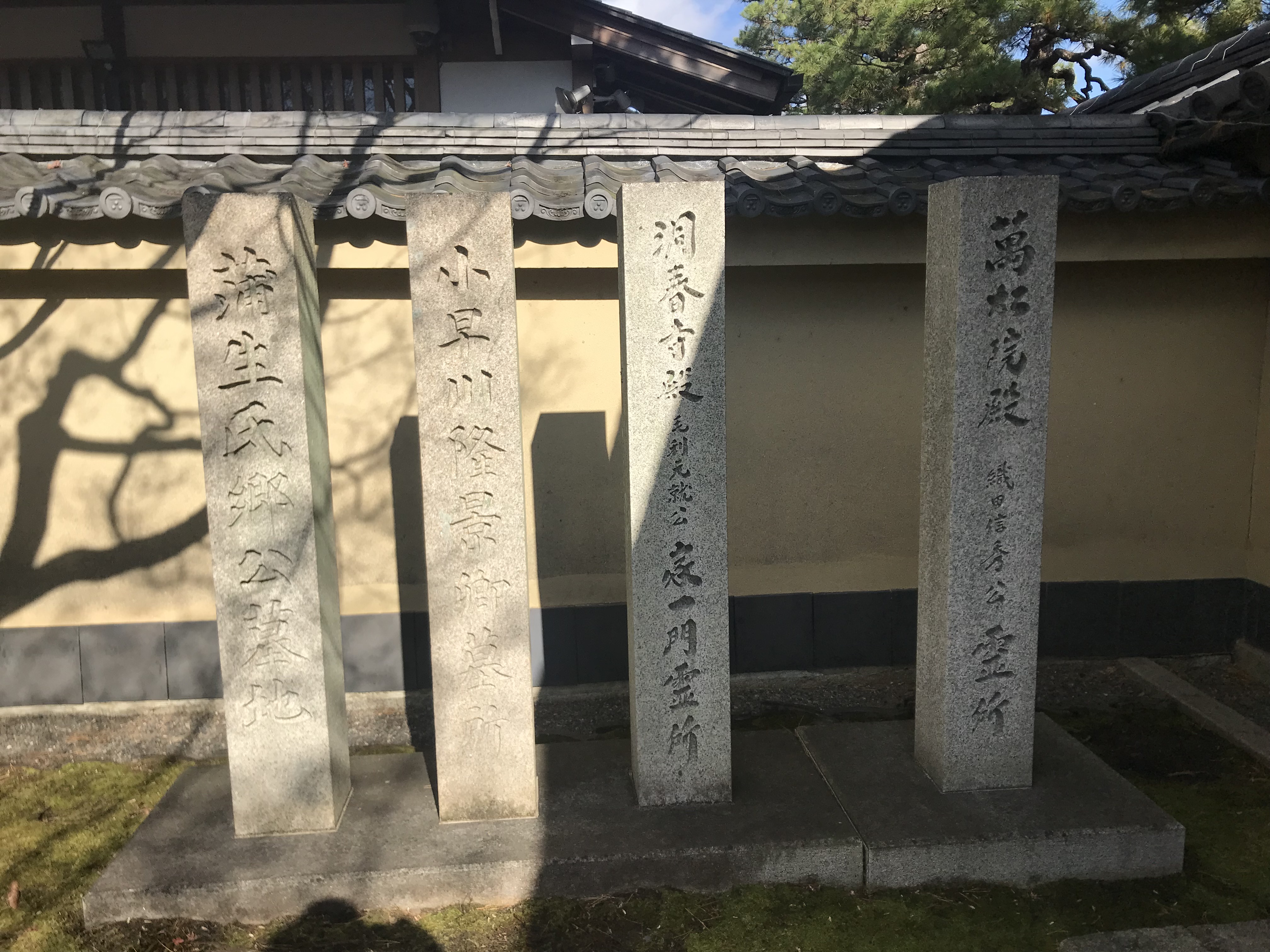 バスに乗り、四条から三条へ移動する。間の悪いことに、同じホテルチェーンの別の宿を予約してしまっていたのだ(京都内の同系列ホテルに宿泊すると特典があると言われて)。そこへ荷物だけを預けてすぐに飛び出す。バスで大徳寺へ向かう。大徳寺納豆の由来書きを読んでから、大徳寺黄梅院に寄る。ここは織田信長が父信秀のために秀吉に建てさせた寺で、信秀の他、毛利元就、小早川隆景、そしてお目当ての蒲生氏郷の墓がある。利休の庭園もあると書かれているが、なぜか入る気になれず、外の庭だけ写真に収めて去る。この扱いを見て、蒲生氏郷の地位が何となくわかる。彼が生きていれば歴史はどうなっていただろうか。