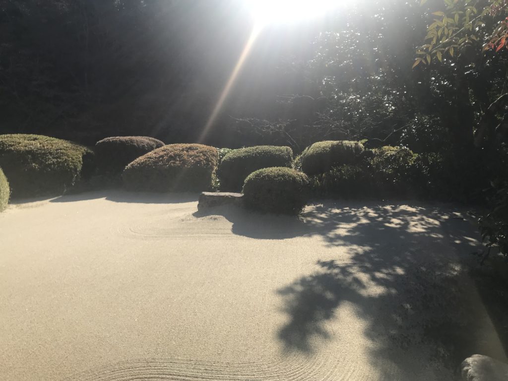 拝観料500円を払って建物の中に入ると、いい空間が広がっている。そして座敷に座って庭を見ることができるのだが、その何とも言えない解放感、癒しの空間に、多くの人がじっと座っている。鹿威しの高い音が響き渡るが話声はない。庭に降りると、下りになっていて、下に庭がある。何とも贅沢な造りだ。すごく天気が良く、小春日和という感じで、テンションが上がる。ずっとここにいたと思える場所。