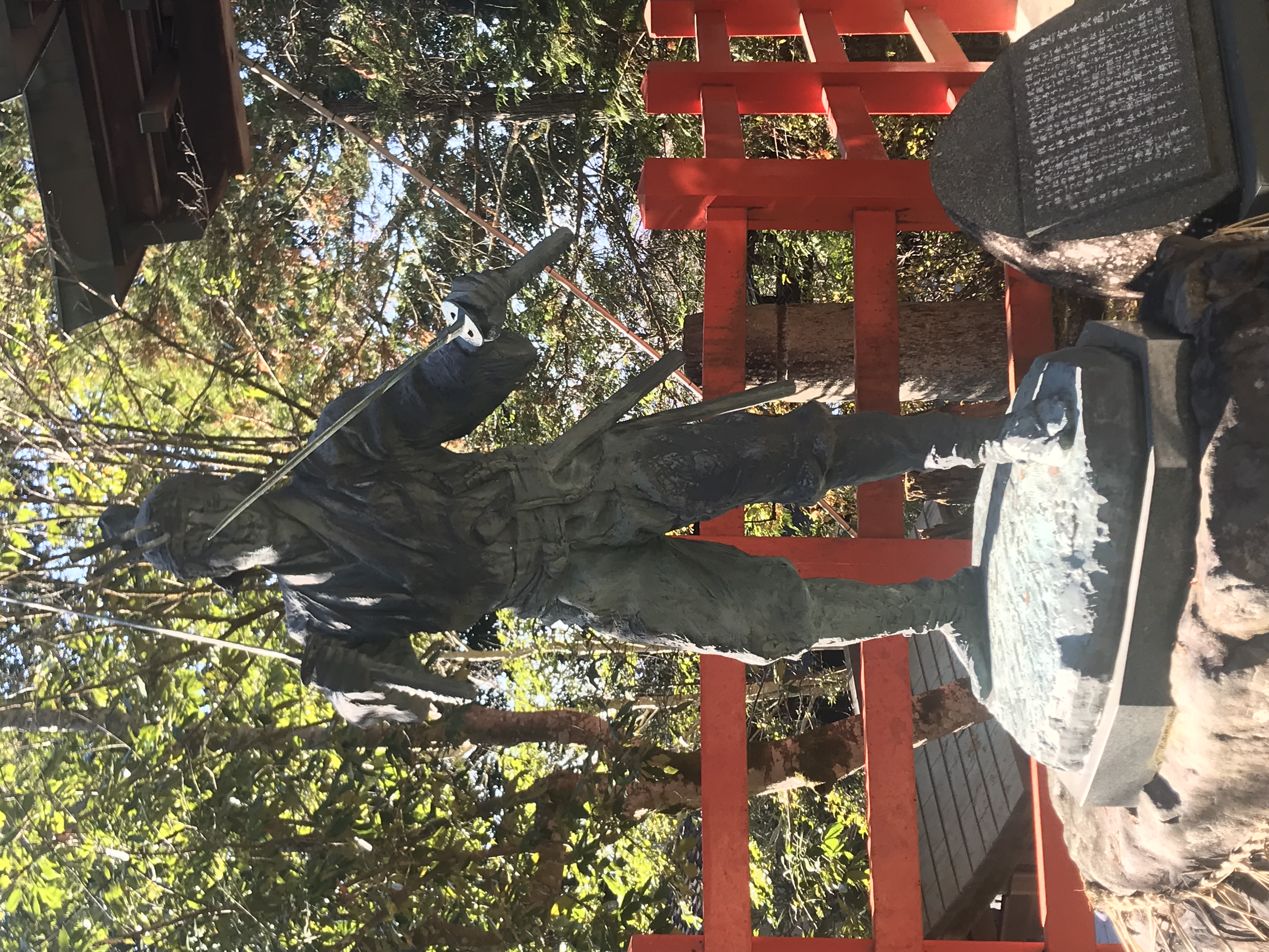 そこから約1時間、鴨川を渡ってテクテク歩いていく。着いたのは宮本武蔵と吉岡一門の決闘で知られる八大神社境内、一乗寺下り松。武蔵のことは以前少し調べたが、ここは時代劇では必ず出て来る場所だった。意外に狭い敷地に武蔵像が建っている。ここで決闘前に神に祈ったという。