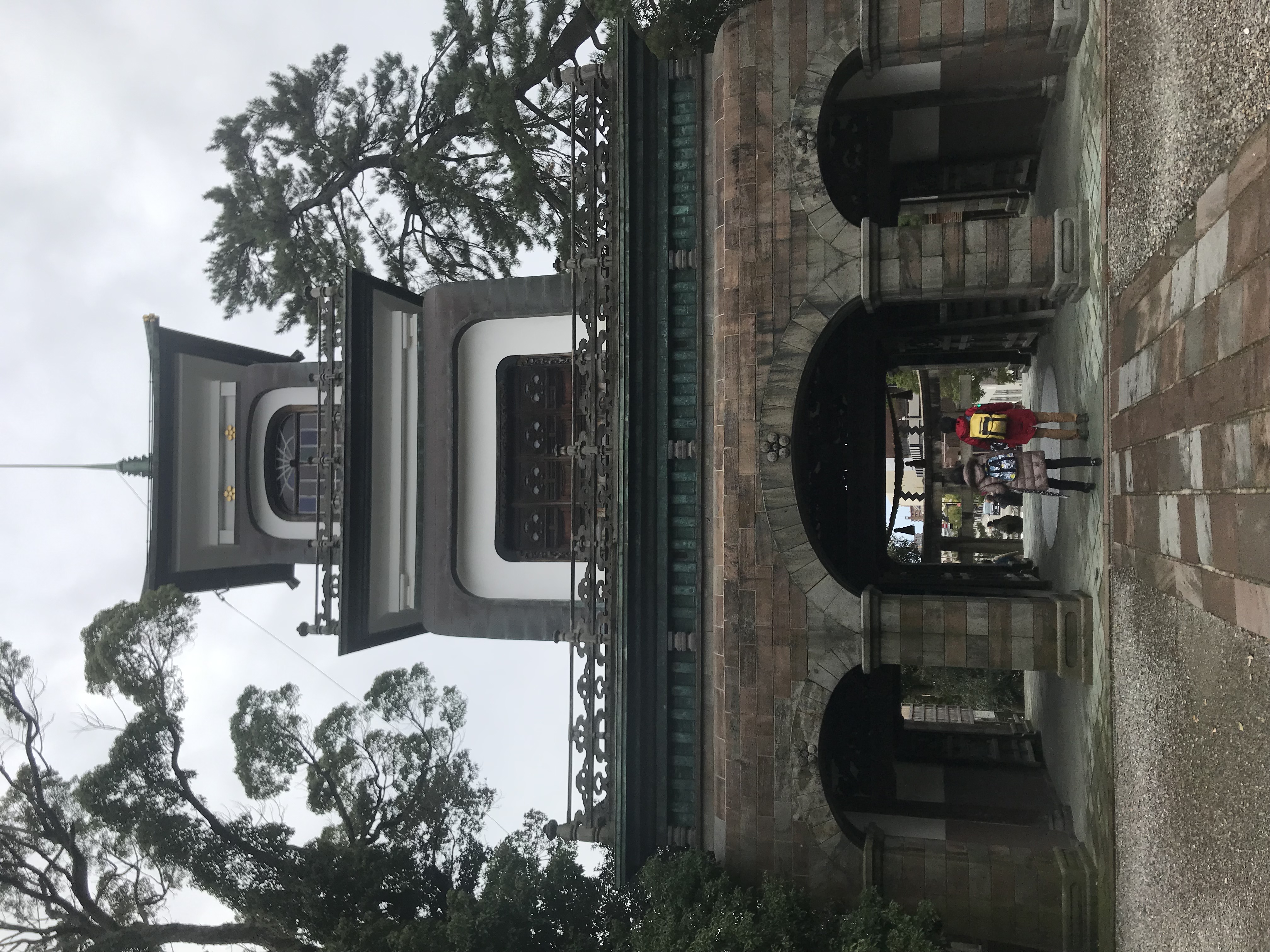 宿を出るとすぐに尾山神社があった。神社に用はないと思ったが、その異様な、洋風な建物に思わず引き込まれ、階段を上る。神社の祭神は前田利家とまつだと書かれており、二人の像もある。そこから裏を回っていくと、いつの間にか道路を隔てて、お城に辿り着く。