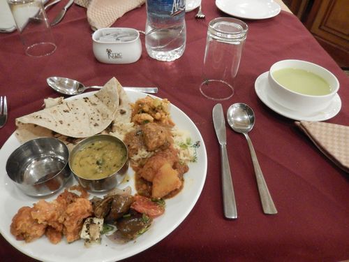 直ぐに山は夕暮れを迎え、急に暗くなった。このホテルには朝食は勿論、夕飯も付いていた。どんなものかと食堂へ行ってみると、本格的なビュッフェだった。スープはコーンスープ、チャパティを取り、インド風のおかずを取ると、その先には鶏肉や魚が置かれている。一応外国人を意識した料理もあるようだ。