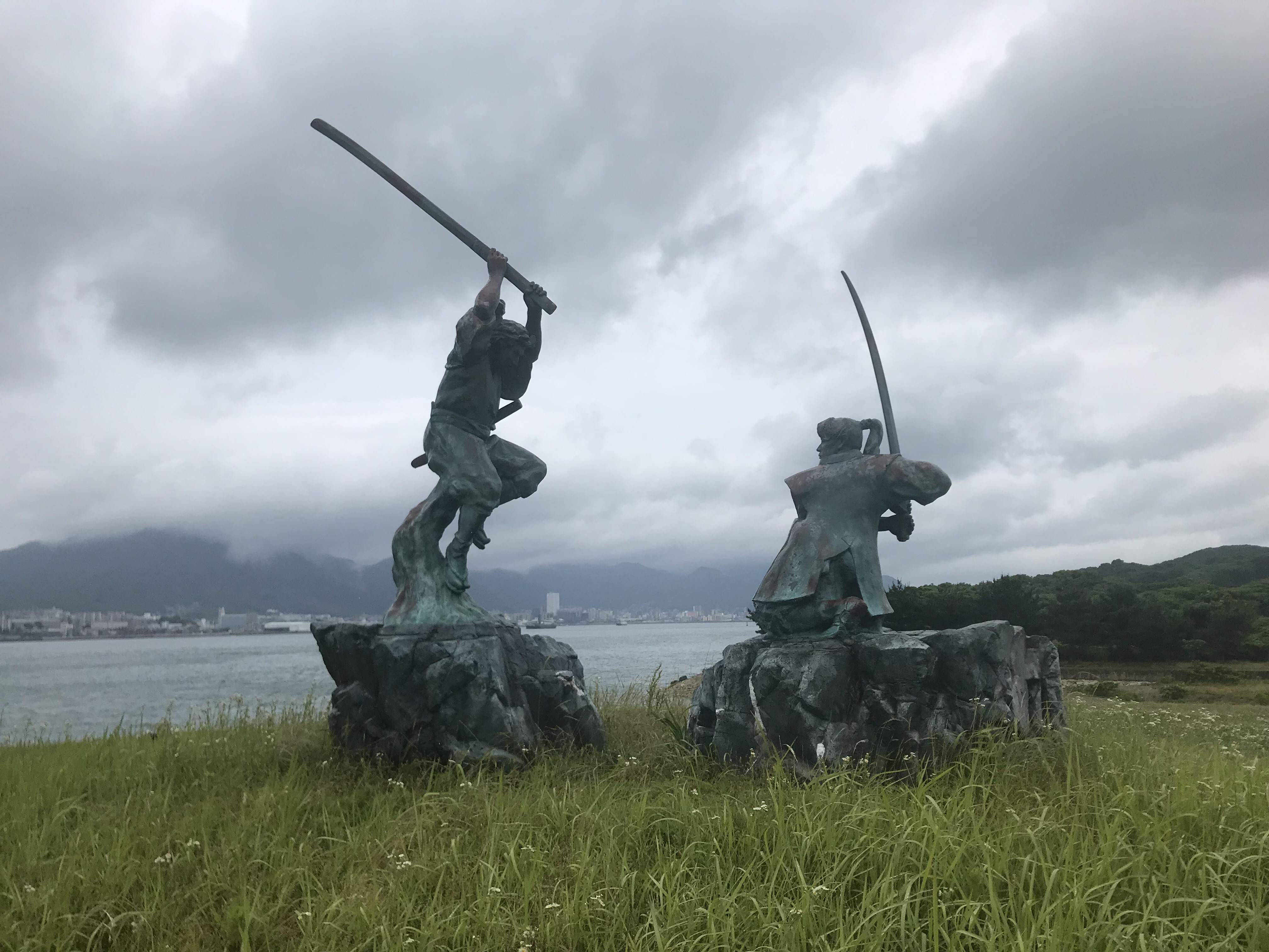 意外と大きな島だった。大正時代に埋め立てが行われたらしい。昭和48年に無人島になったというが、現在は観光地として草がきれいに生えている。少し歩くと関門橋をバックに武蔵と小次郎の像が置かれ、撮影スポットになっている。武蔵が渡ったのと同じような小舟が展示されている。残念ながらこの島は一周することができない。対岸に見える三菱重工の工場、そう三菱がここの一部を所有しているらしい。