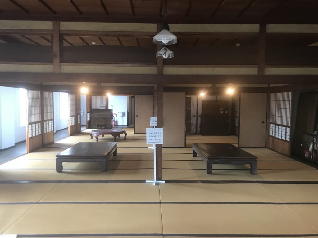 2,3階には畳部屋の大広間がある。部屋数もすごく多い。洋館に畳の大広間、このギャップが何となく大正を感じさせる。ここで大宴会が開かれたであろうことは想像に難くない。洋間もごく一部あるようだが、開放されていなかったので、余計に畳の印象が強くなる。屋上は現在開放されておらず、日本庭園を見ることは残念ながらできなかった。