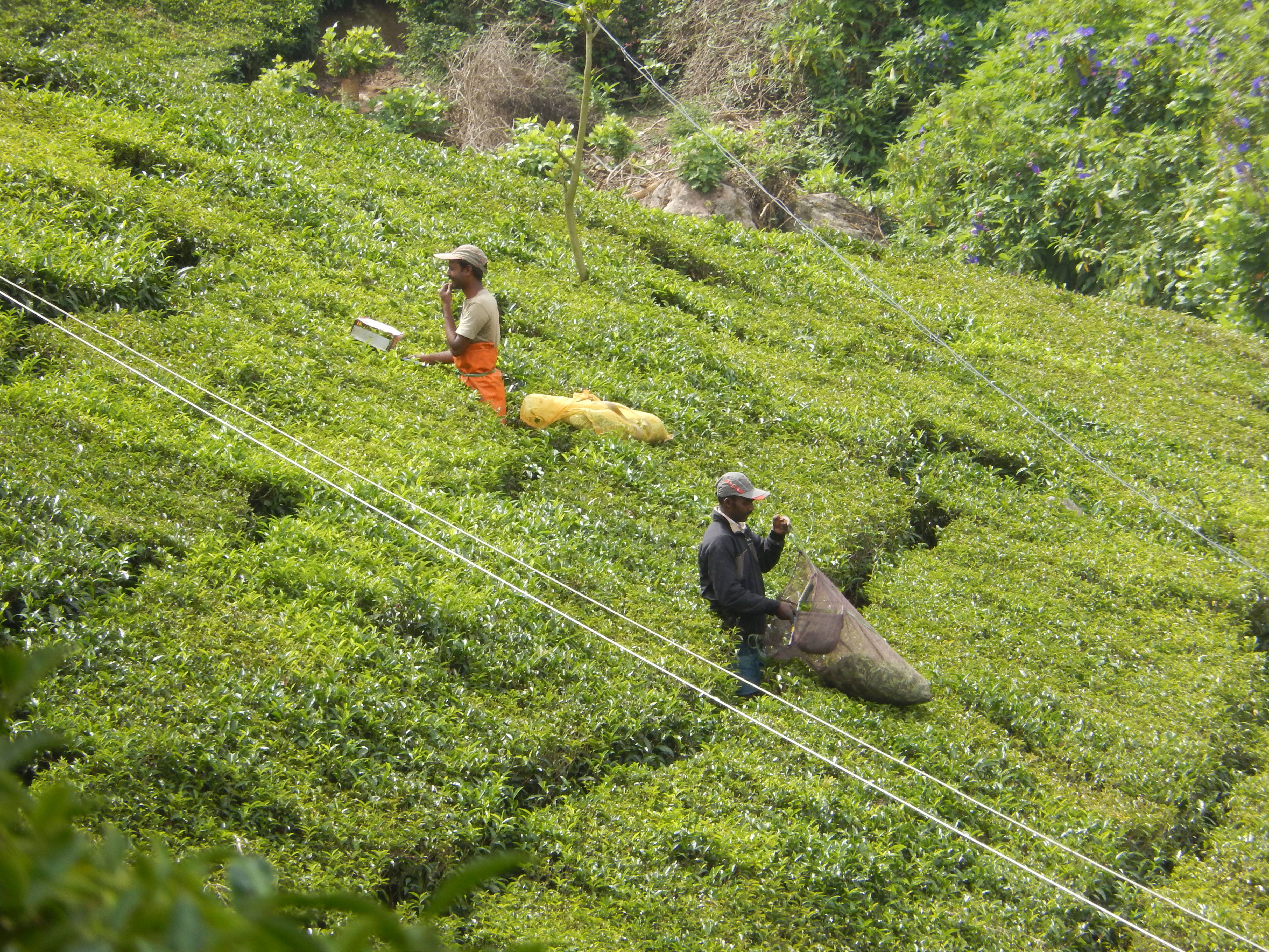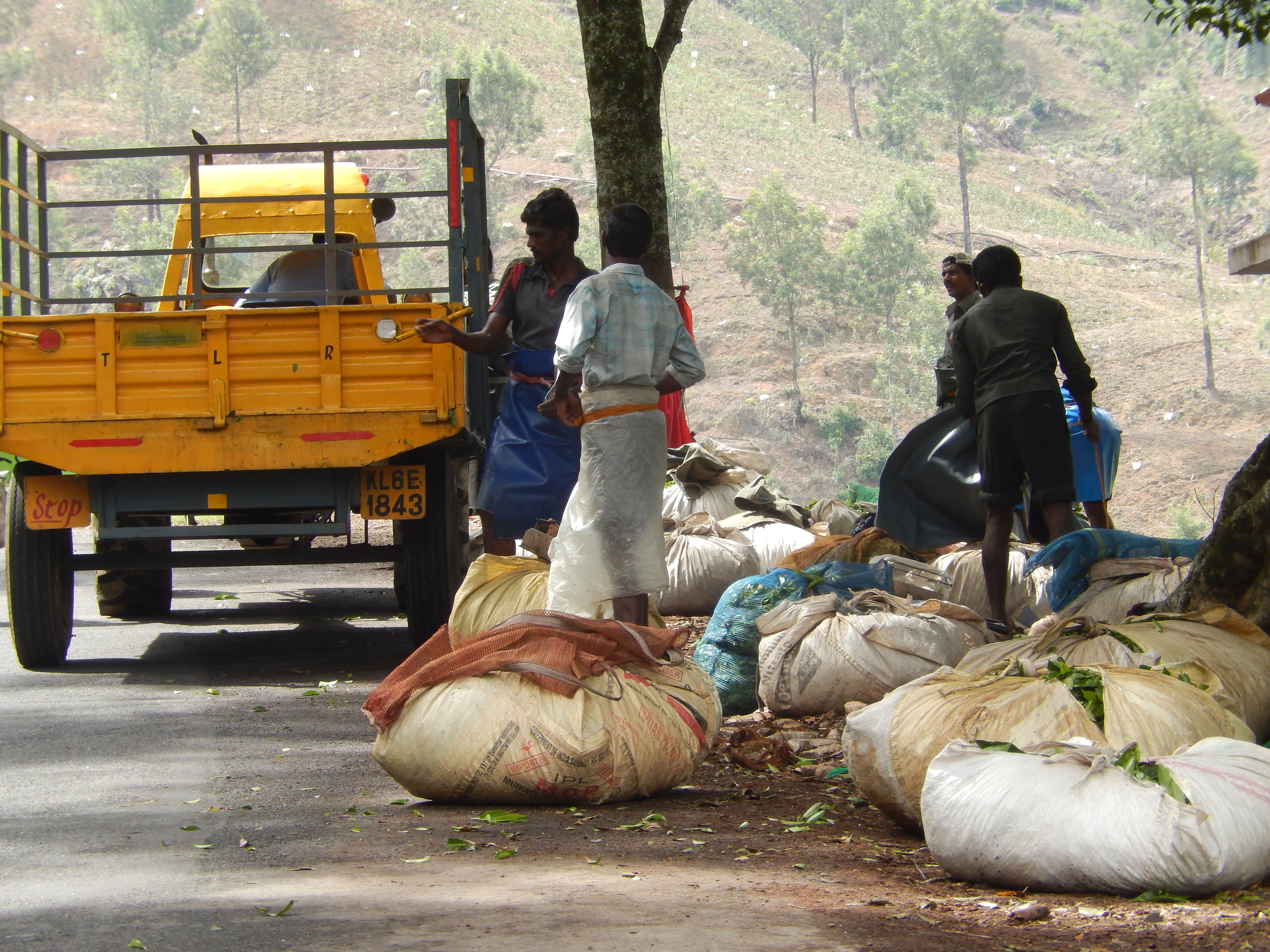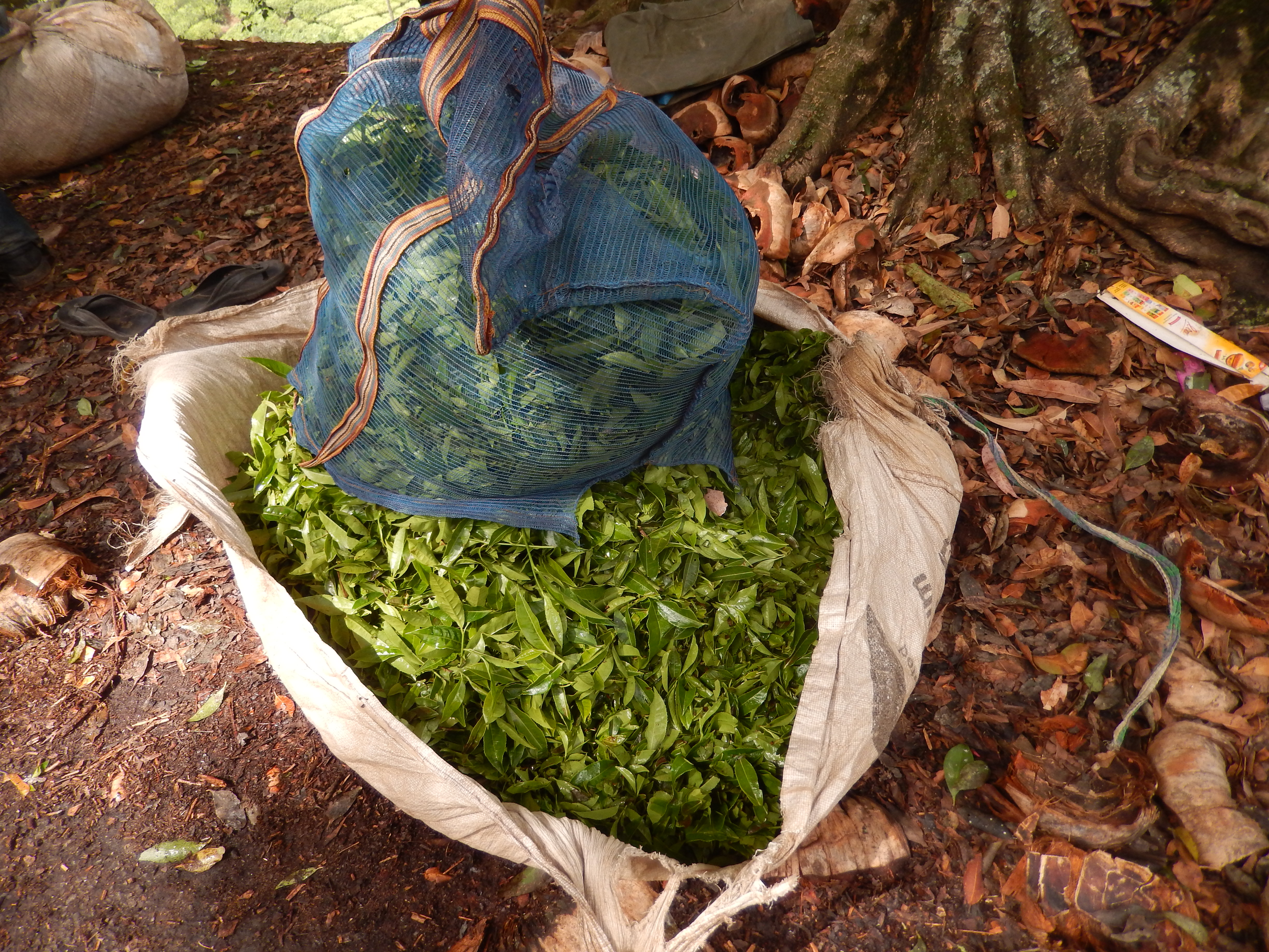 昨日博物館のスニール氏に『どこか工場は見られないか』と聞いたところ、タタ財閥と関係ない茶園を紹介してくれた。今日はそこへ行ってみる。昨日はストライキで人影がなかった街、今日は何事もなかったように人で溢れている。本当に分からない。街道沿いの茶畑でも茶摘みをする男性が見られた。ここでは茶摘みを男性がしているのか?確かに斜面では男性の方が摘んだ後の茶葉を運ぶなどに適してはいる。鮮やかに摘まれた茶葉が布袋に入っている。とてもきれいだ。