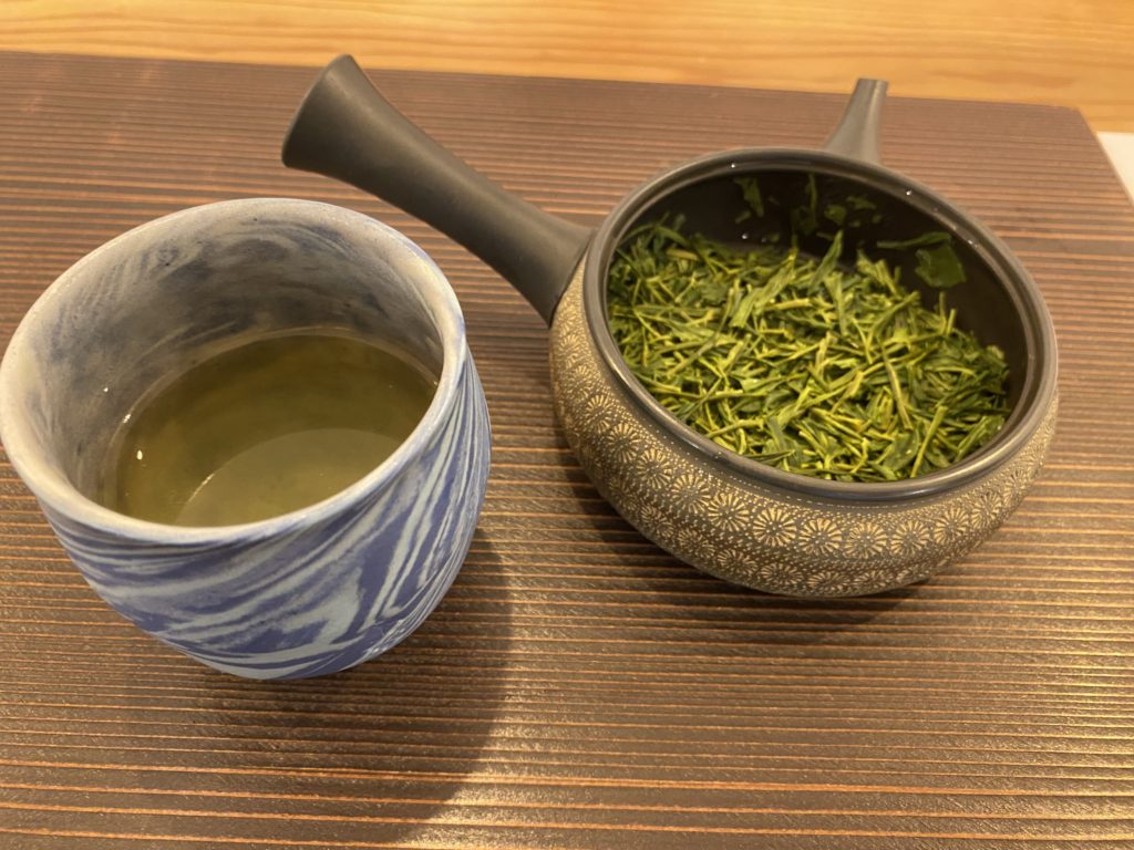 ビルの2階、看板が無ければ通り過ぎてしまうようなところにそのカフェはあった。店主のIさんとは以前一度会ったことがある。そのカフェが最近人気だと聞き、訪ねてみたのだが、カウンターとテーブル合わせて8人を相手にIさんは一人でお茶を淹れている。それも冷たいお茶から淹れ方を変えて4煎ぐらいまで、様々な茶の魅力を見せ、解説してお客を楽しませている。