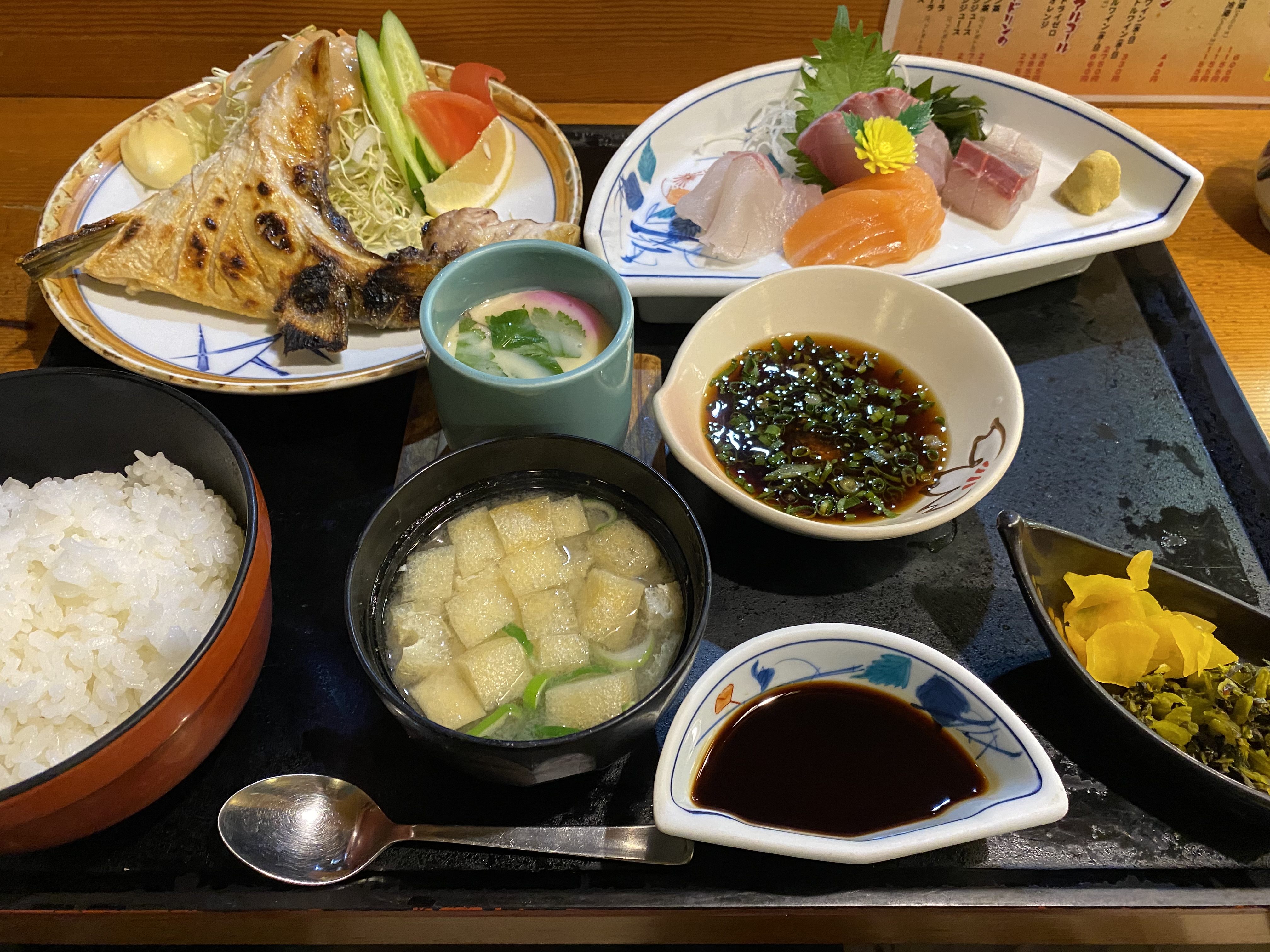 さっきうどんを食べたのに、また物足りなくなって、夕方定食屋を探してみる。するとお食事処があったので入ってみると、なかなか立派な夕飯が出てきて驚く。これは定食というより、お刺身御膳だろうか。さしみも分厚いし、魚のカマ焼きの塩加減も絶妙だ。味噌汁もうまい。まあいいお値段で私には贅沢な夕食だが、偶にはこういう経験も良い。
