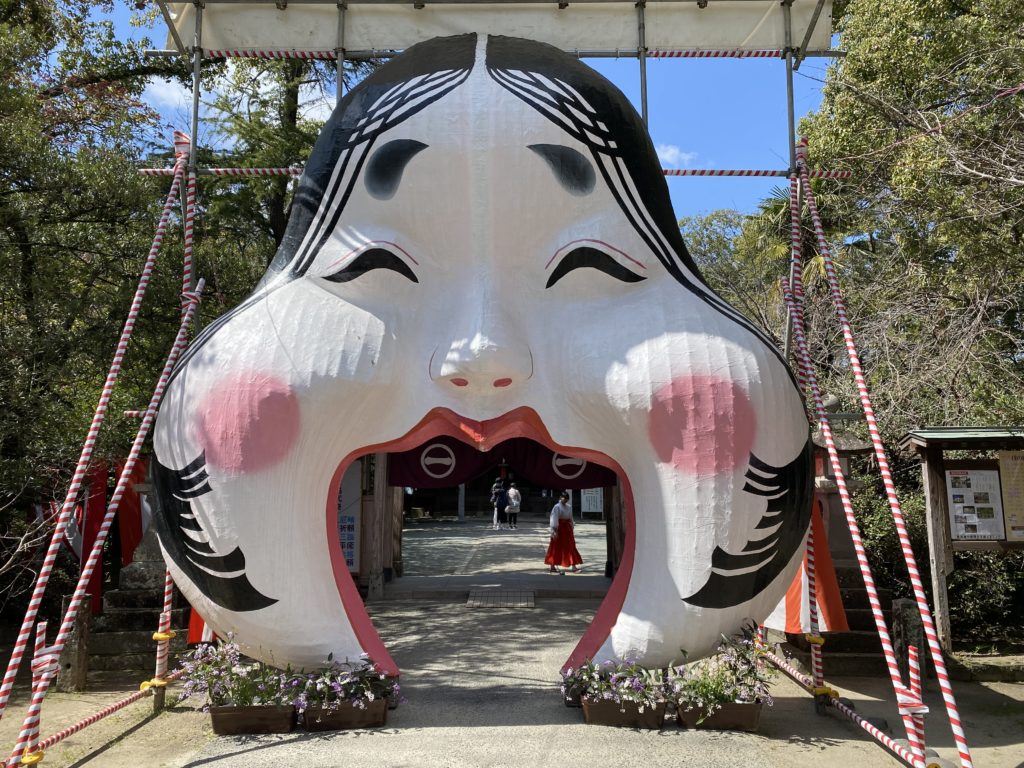 川沿いを歩いて行くと、田中吉政という名が出て来る。柳川の武将といえば立花宗茂だが、その後は田中吉政がここを築いたらしい。関ケ原の戦い後、石田三成を捕らえたのはこの吉政だったらしい。立派な像も建っている。日吉神社まで来ると、大きなおかめに迎えられた。婚礼用の写真を和装で撮るカップルが初々しい。