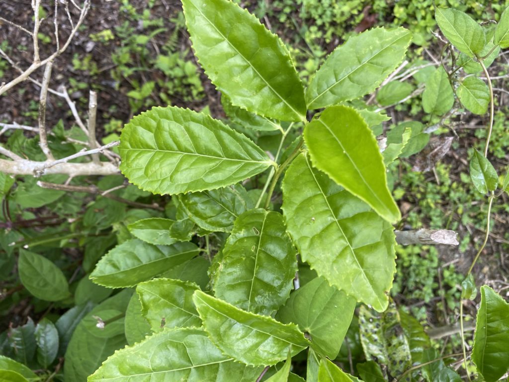 Mさんが連れて行ってくれたのは、丹生ノ川という場所。丹生と聞くだけでテンションが上がってしまう。四国愛媛にもあった丹生。確か島根にもあった地名だろうか。水銀と関係があるとも聞いたが、茶との関連を是非追求したい。ここに1本だけ大きな葉の茶の木が残っていた。確かに普通とは違う。後で聞くと、コウロ種ではないかという。このような茶樹はどこから来たのか、中国から渡ってきた可能性はないのか、実に気になる所だ。