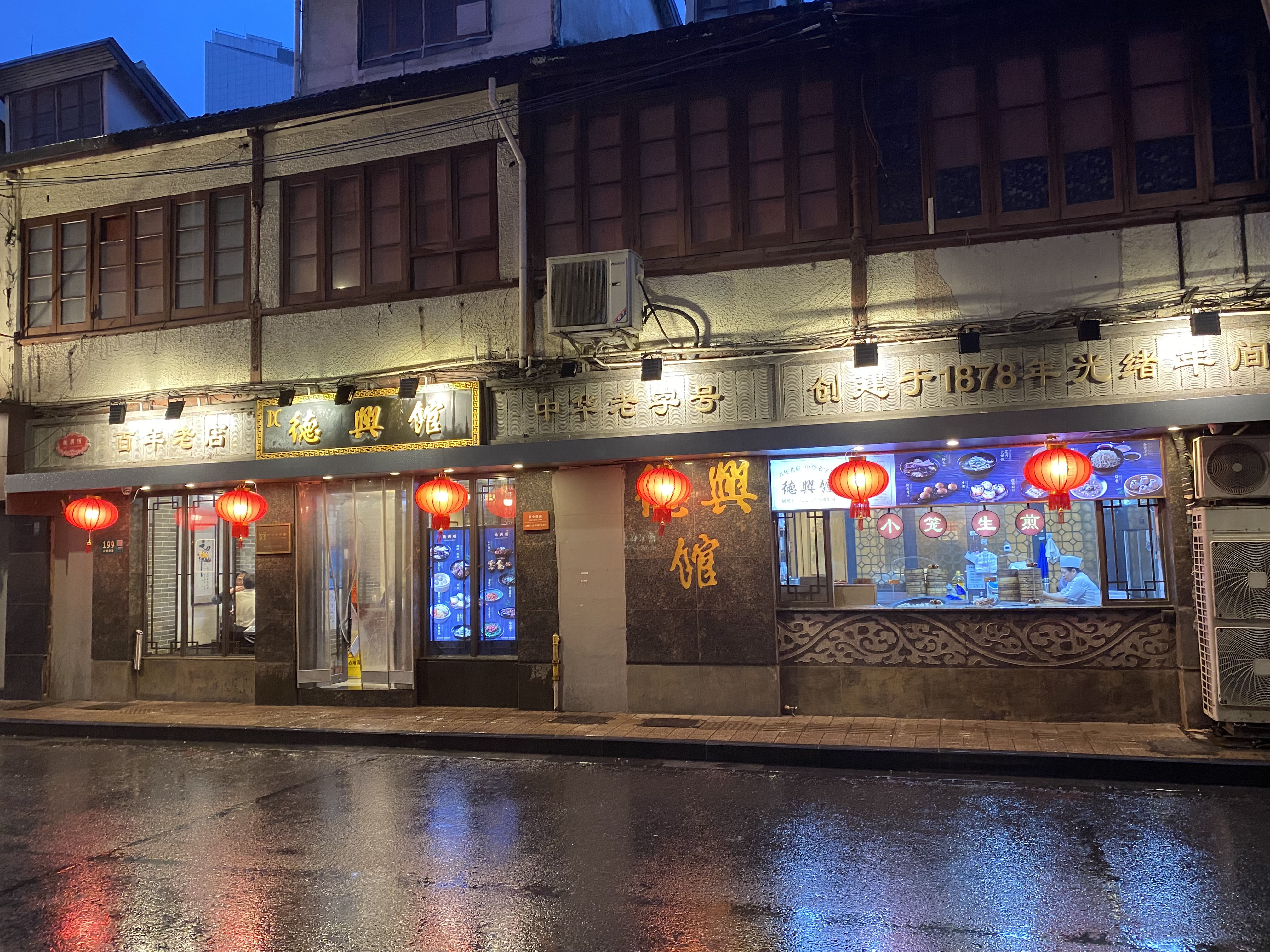雨に降られて仕方なく宿まで戻ると、正面に中国老字号というレストランがある。こういう古いお店が私にはよかったが、一般中国人の評価は高くない。徳興館、1878年創業とある。伝統的な麺はと聞くと、三鮮麺を指す。小籠包と生煎包で生煎包を選ぶ。生煎包33元は4個皿に載って来た。大きめだが何となくぼんやりした味わい。汁はすぐに外へ出てしまう。