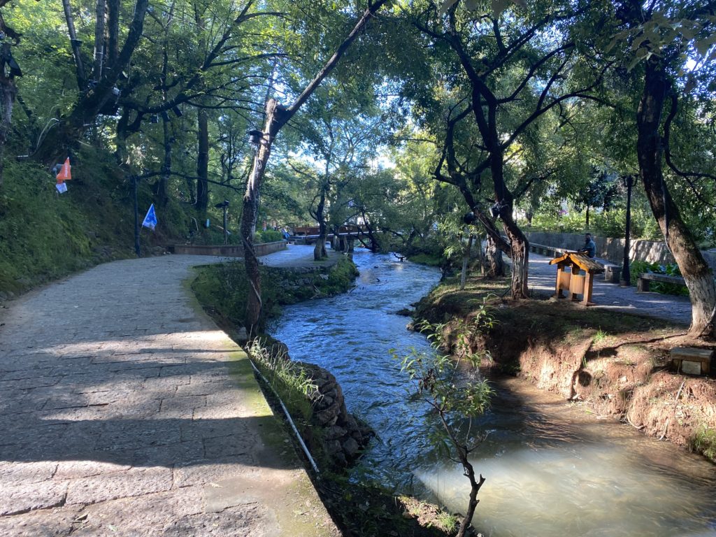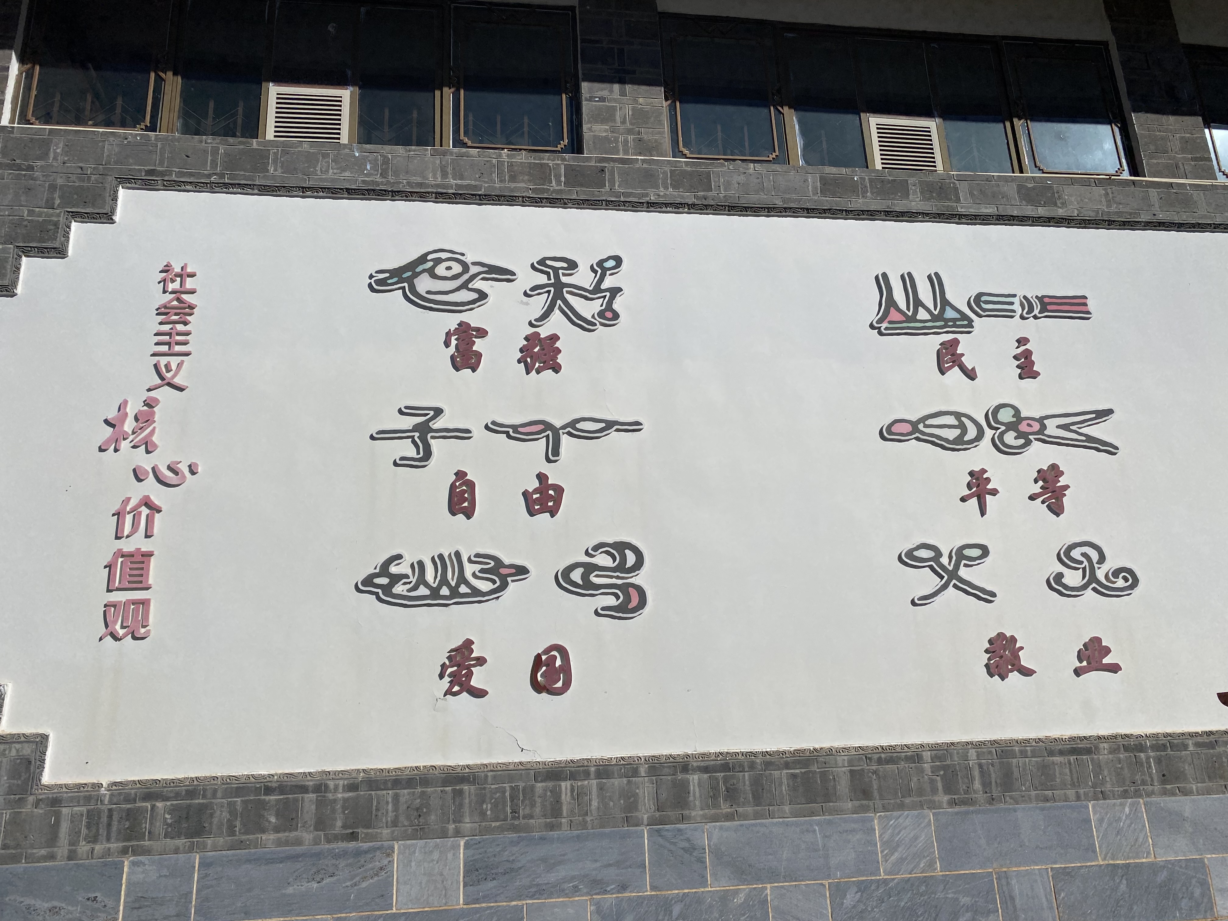 朝日が眩しい。今日も天気は良いが、何となく頭が重い。それでも取り敢えず宿で麺を啜り、外出する。ちょっと古城を歩き、今日もまた別の出口から車に乗る。昨日に比べて空いているのは、今日が中秋節だからだろうか。麗江市博物館へ向かう。入口にはトンパ文字が描かれているが、「社会主義核心価値観」と書かれていると、少し興ざめしてしまう。中の展示はトンパ文化に関するもので、少し勉強になる。ナシ族についてはもっと知るべきだろう。