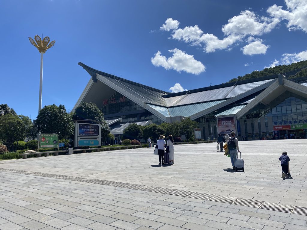香格里拉行き列車は2時間に一本ぐらいあり、時間通りちゃんと来て、ちゃんと動いて行く。途中トンネルもあるが、いい天気の風景も見えてくる。臨時停車(列車の行き来の関係)したところが、きれいな渓谷の風景で、皆が写真を撮る。1時間40分ほどで、香格里拉駅に無事到着した。