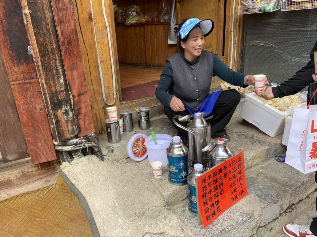 そこから観光街を歩いて行く。ゆっくり歩いてもやはり息は切れる。路上でチベット族がスーヨー茶を売っていたので、試しに一杯飲んでみる。5元。私の記憶にある38年前のチベットのバター茶は強烈なヤクミルクの香りと味で飲めなかったが、今は牛のミルクなのか、観光客向けになっている。よく見るとそこここにドリンクスタンドがあり、皆が茶を飲んでいる。因みに私は塩ではなく、甘い茶を選んでいる。
