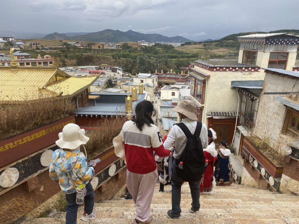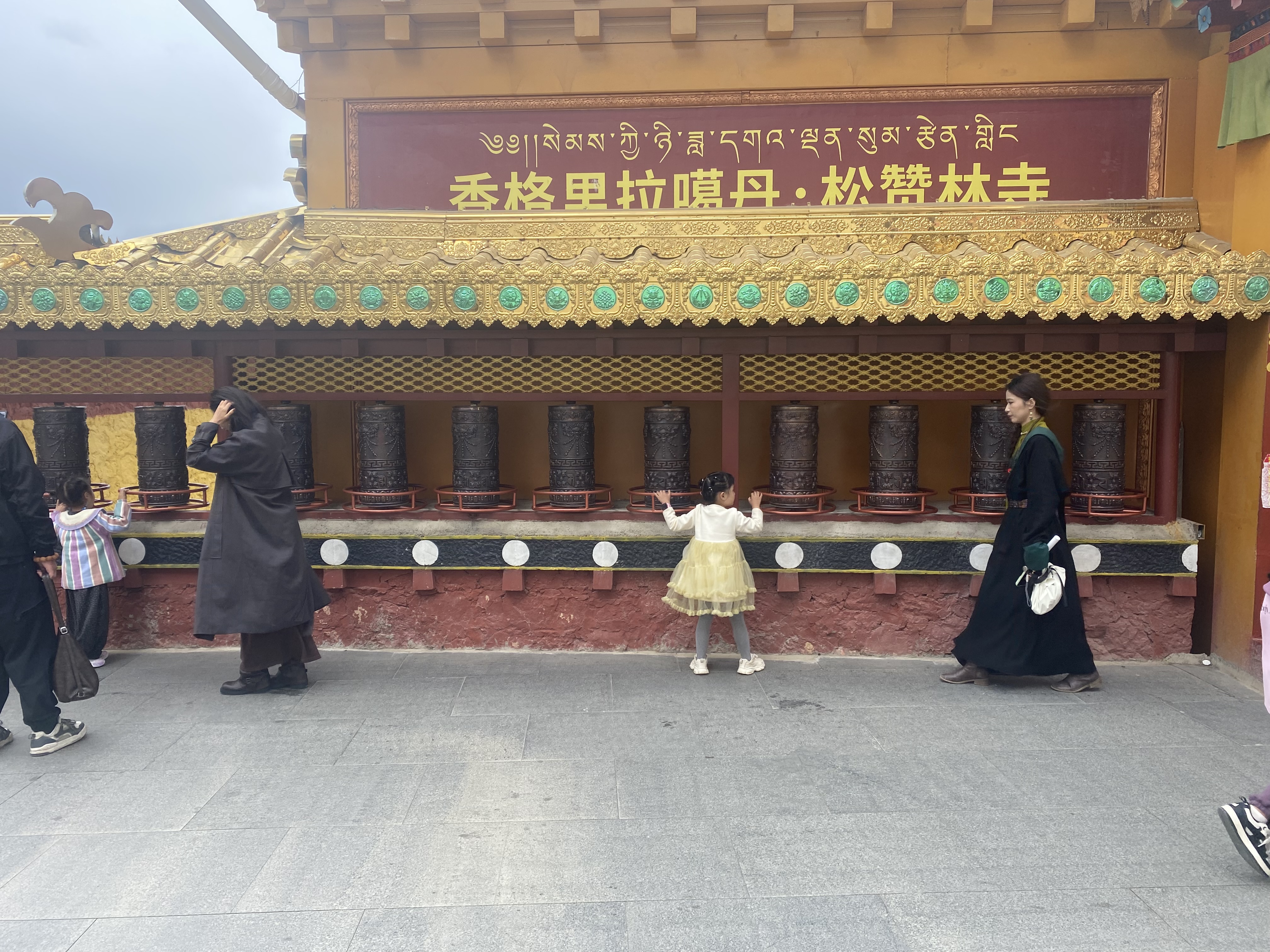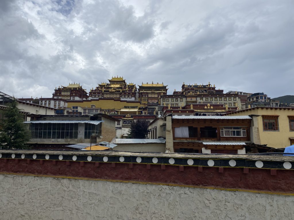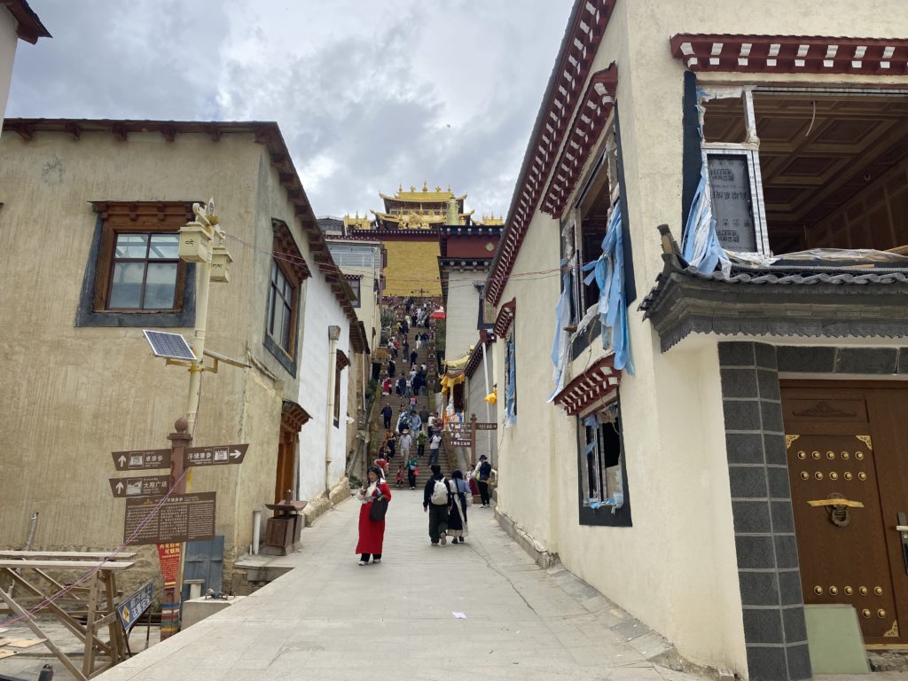 この辺には若者の漢族観光客がかなりいたが、その殆どがチベット族の衣装を着こんでコスプレで写真を撮っている。小さなマニ車を持っている者もいた。実際のマニ車を回しながら写真に納まる者もいる。大きな仏殿があり中に入ると、まるでラダックで見た配置の作りだった。僧侶が信者の話を聞いているのが良い。